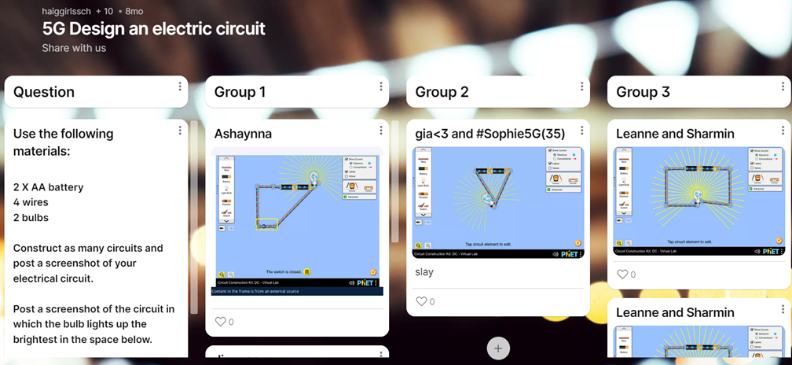 Students built electric circuits using online simulations, and learnt collaboratively on padlet. |