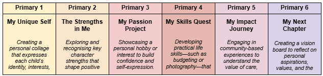 Through Remarkably You, our students embark on a progressive journey from Primary 1 to 6 that nurtures identity, voice, and purpose. Each level offers thoughtfully designed experiences that help students understand themselves, build personal strengths, develop practical life skills, and contribute meaningfully to their community. Along the way, they grow into confident, self-aware individuals equipped with resilience, adaptability, and a growth mindset—skills essential for thriving in today's world.