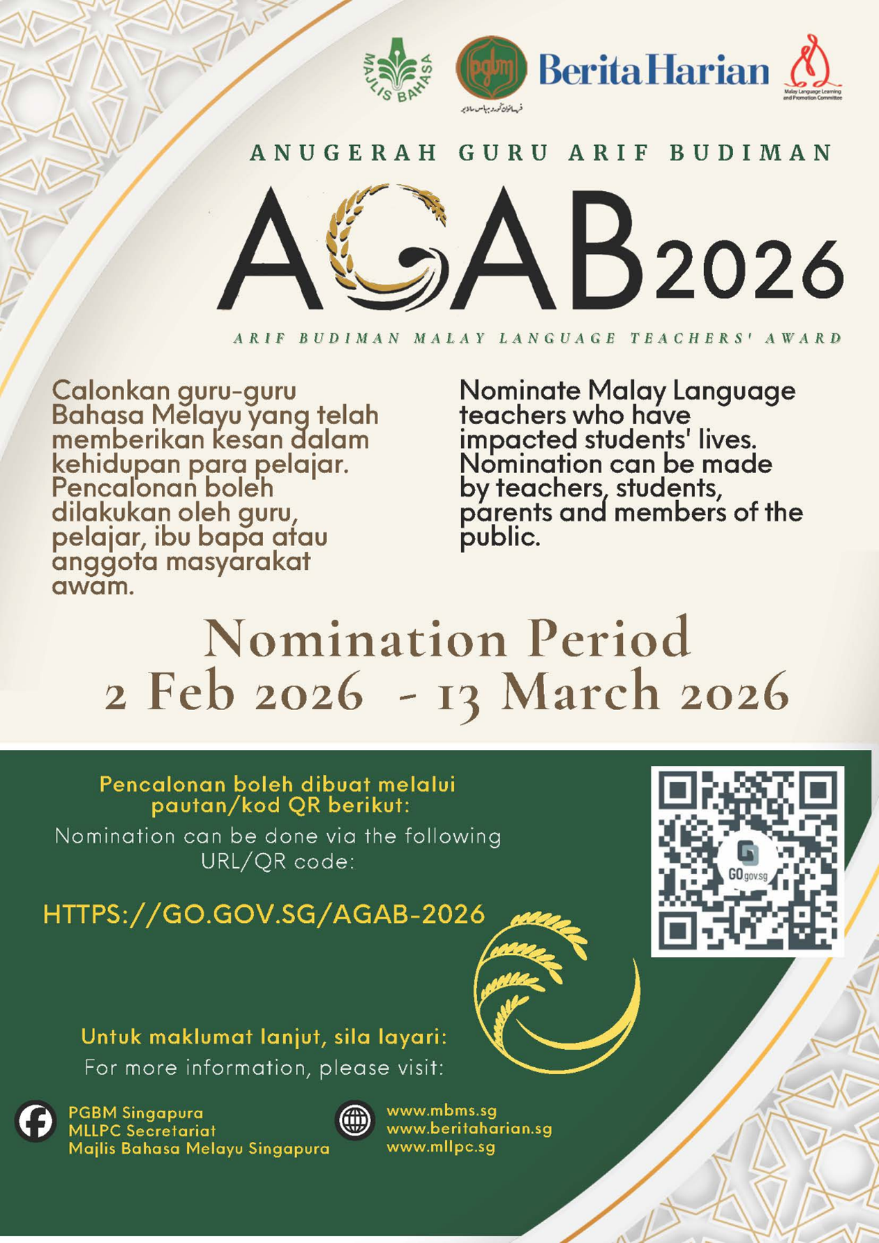 Nominate your Malay Language teachers now by submitting the nomination form at https://go.gov.sg/agab-2026 or scanning the QR code on the e-poster.