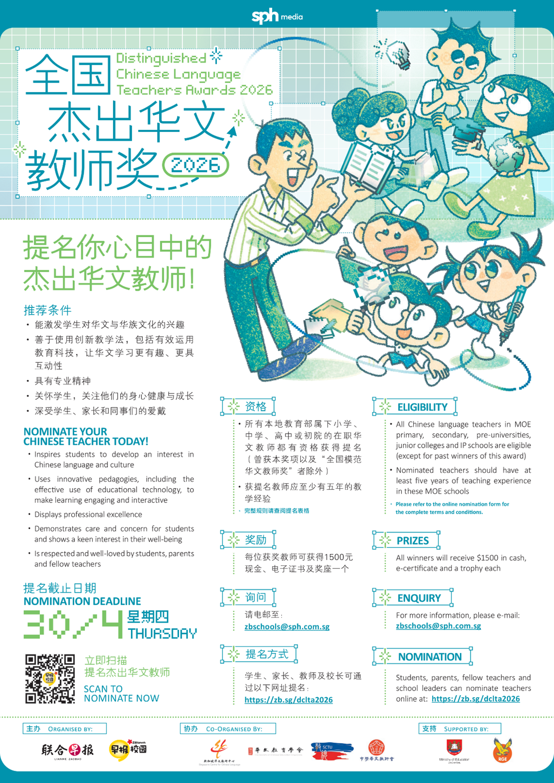 Nominate your Chinese Language teachers now by submitting the nomination form at https://zb.sg/dclta2026 or scanning the QR code on the e-poster.
